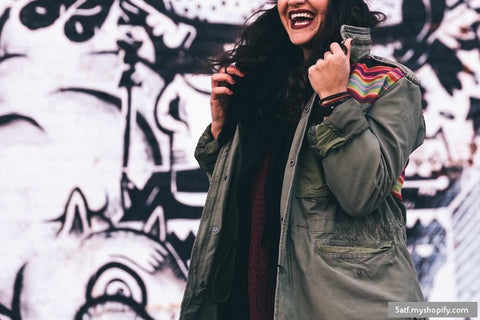 Loose fitting olive green jacket with buttons and large pockets. Multicoloured pattern on the front of the shoulders.